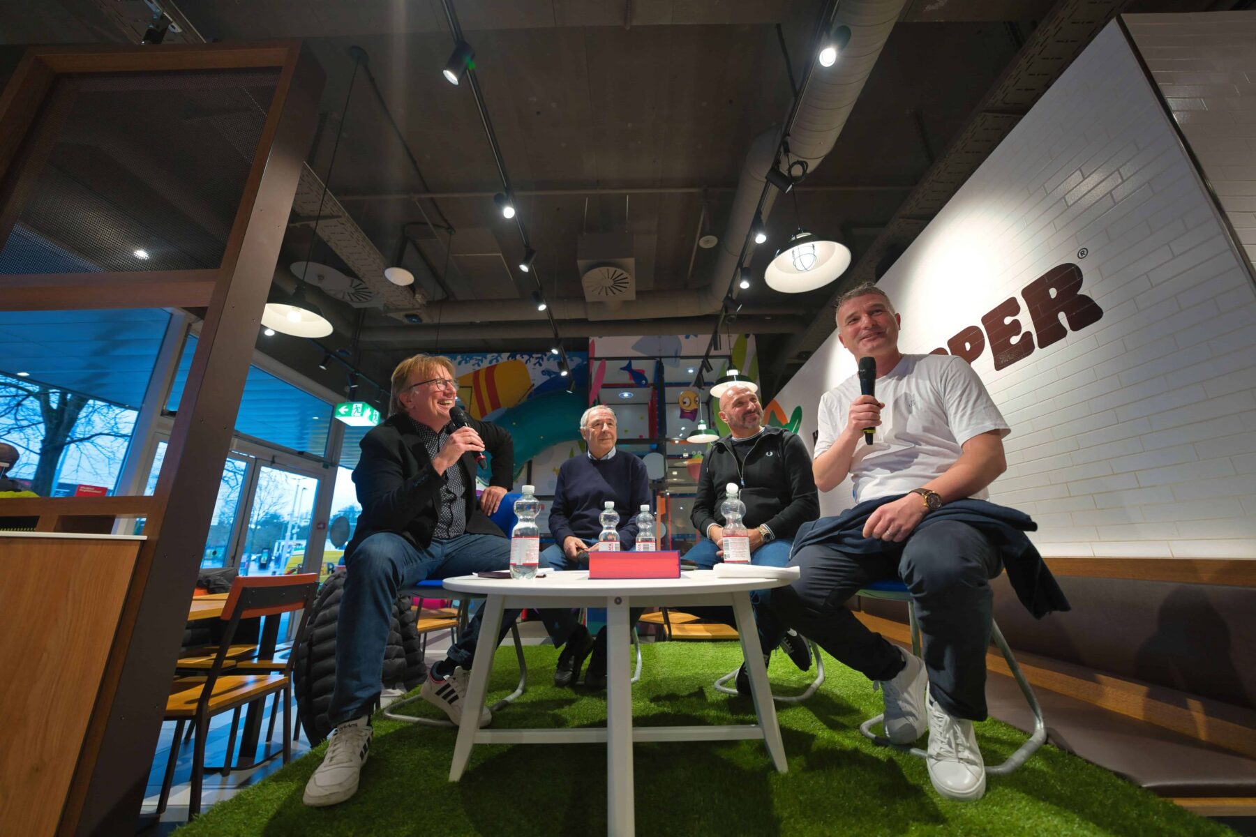 Zur Eröffnung waren mit Alex Frei, Massimo Ceccaroni und Otto Demarmels gleich drei ehemalige FCB-Spieler vor Ort, die selbst Teil der Wand sind. In einem öffentlichen Gespräch gaben sie Einblicke in ihre Zeit beim FC Basel. Moderiert wurde das Gespräch vom bekannten FCB-Kenner René Häfliger.